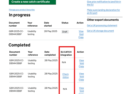 You will not see a ‘check status’ link for documents for exports not going to the EU. For example, documents for exports to China will not be transferred to EU CATCH.